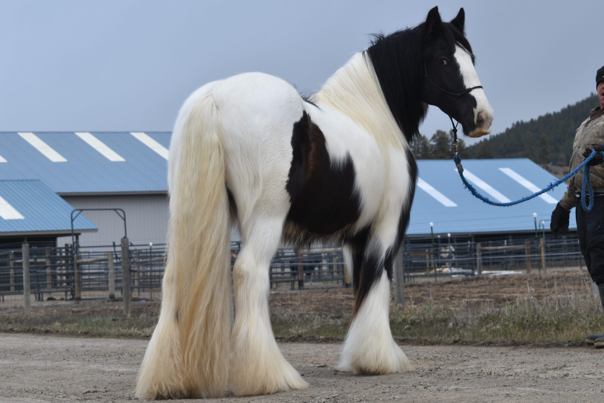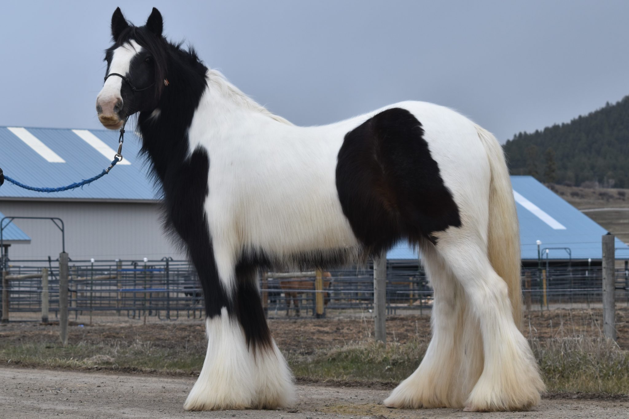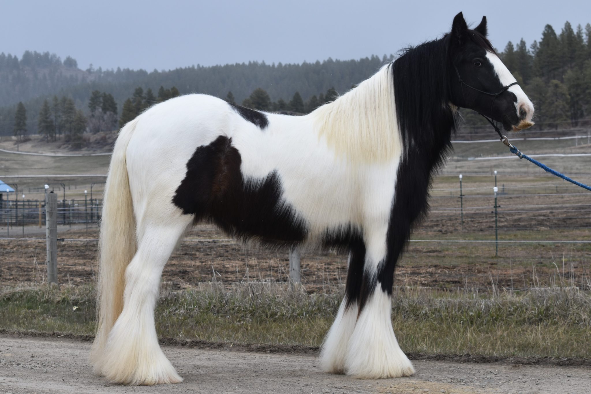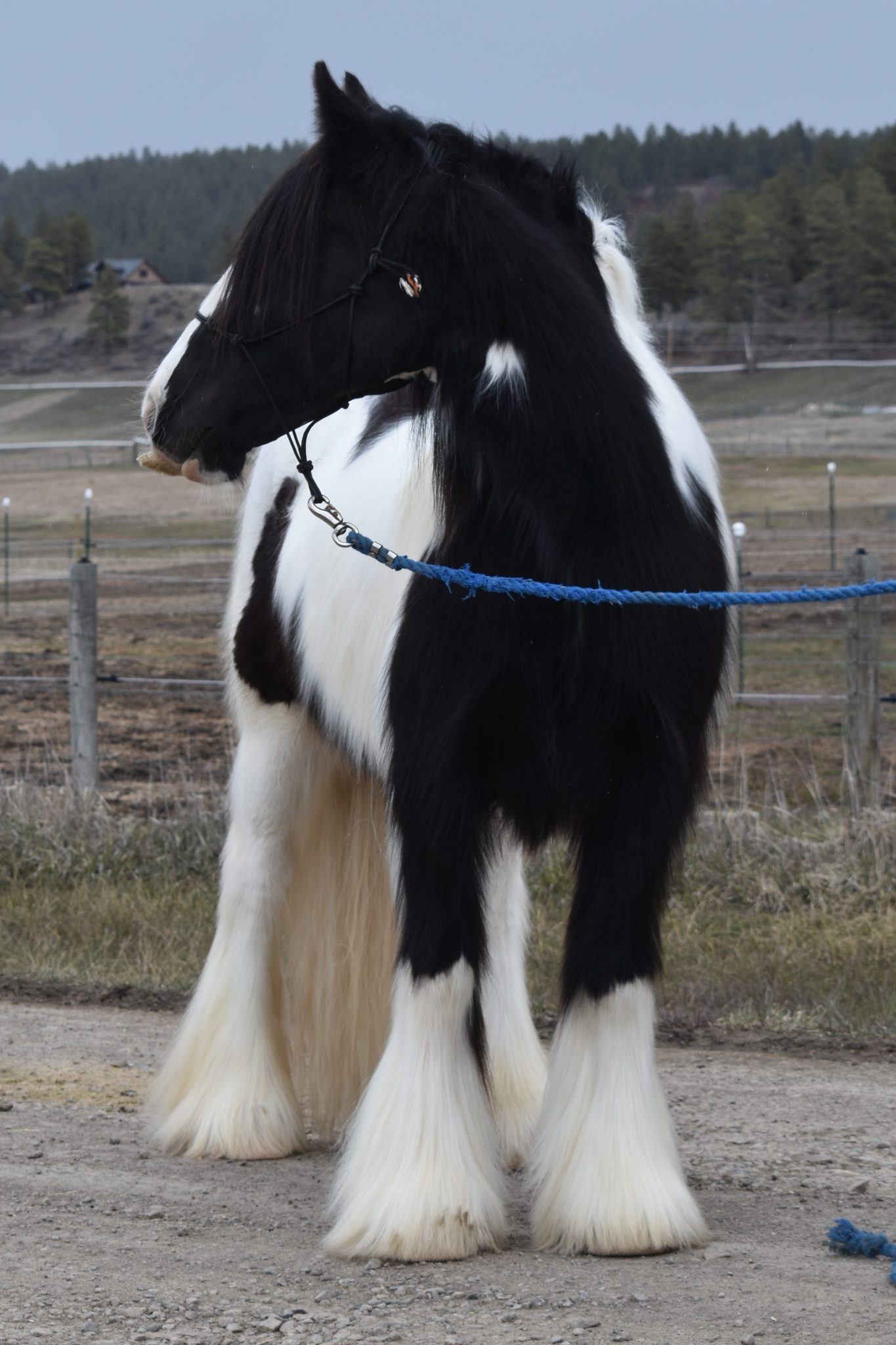 SSFR Spot On, or Dotty as we call her, is a lovely filly out of Rackli and by Teddy, The Heavy Horse of Wales. Dotty is exactly what we were hoping for when we crossed her sire and dam. She is starting into her training and is smart and responsive. She should mature around 14h3″. She is a traditional Gypsy Vanner by anyone’s definition. We plan to keep this filly for our breeding program. She is being bred to Sterling for a very traditional type foal in 2021. 4/20