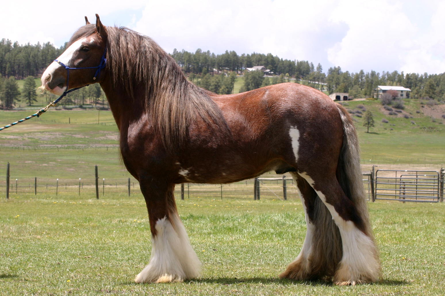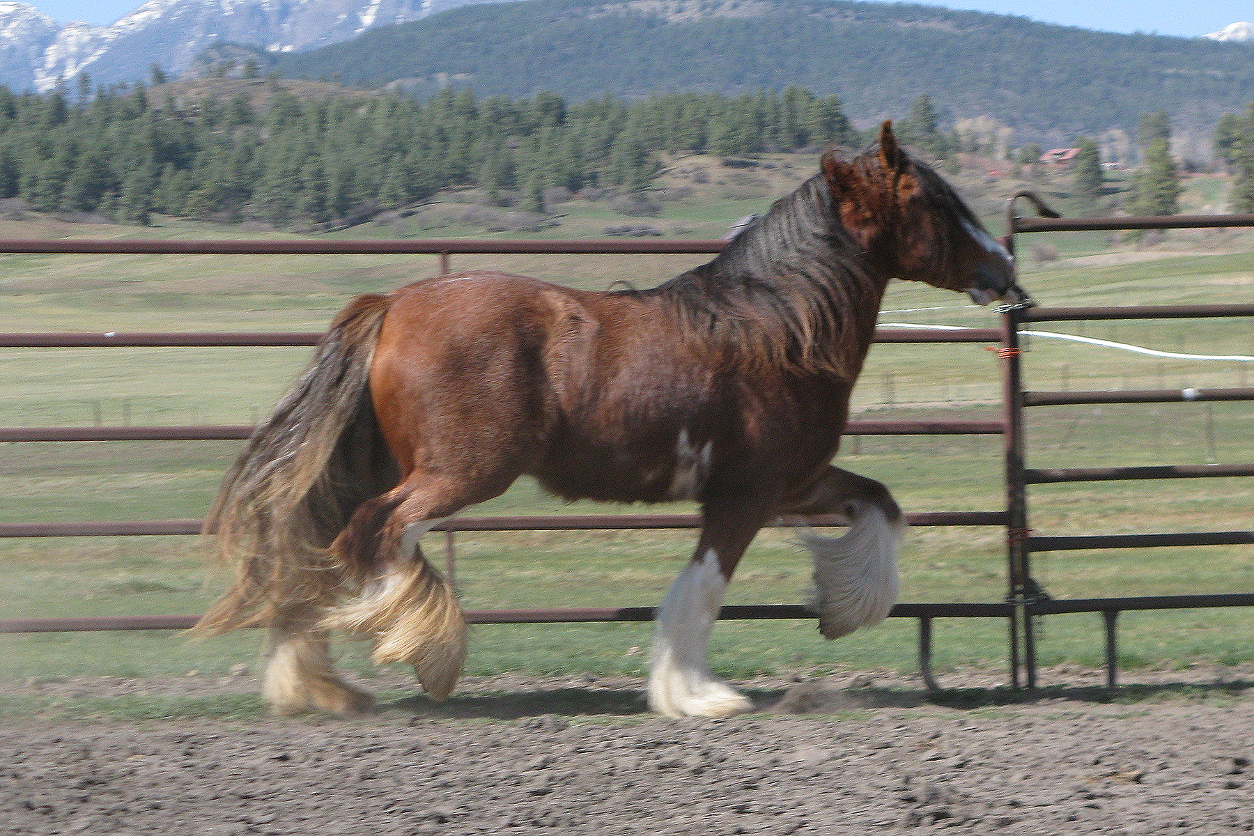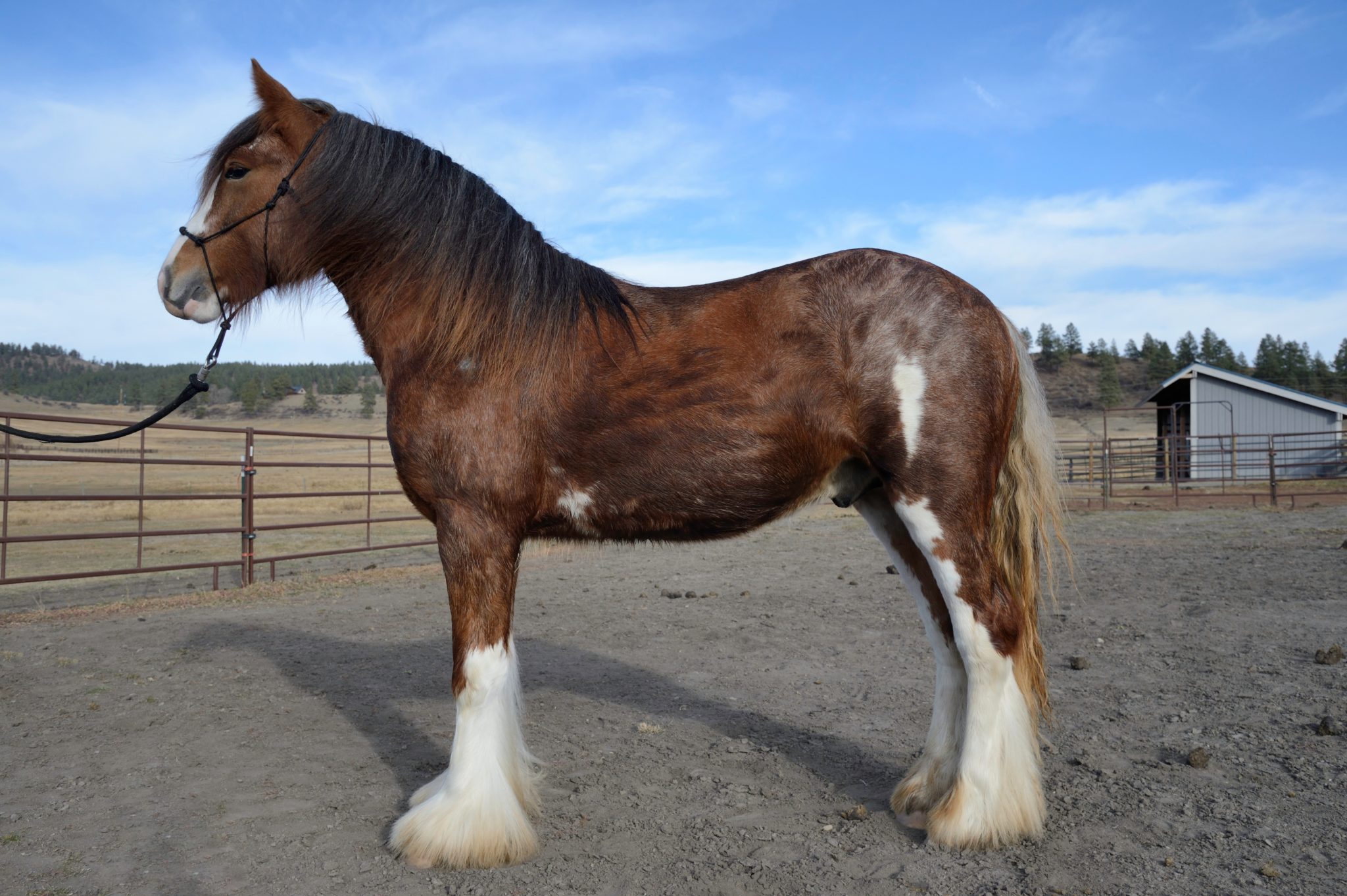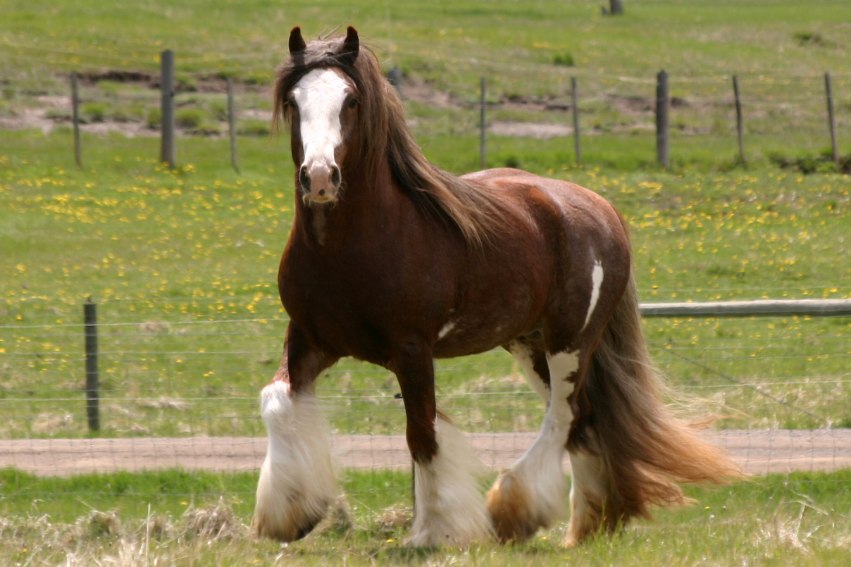 On a trip to Buffalo New York to see the amazing stallion Prime Time, this special colt caught my eye. Bred and raised by the Sahlem family, Whiskey, Sahlem’s Country Maker’s Mark, is an amazing find from a great breeding program. His sire is Simon from West Hills Gypsy Horses. Simon, who we saw and loved at George and Kristina’s, has back breeding that any gypsy would be proud to have in their stallion and herd. We are pretty sure that his dam WHF Acorn carries a sooty gene, which on red frequently creates liver chestnuts. Whiskey is chestnut with roaning just like his sire: not true roan but an effect caused by the sabino gene,. This gene was contributed by the the Clydesdales and Shires used to create the Vanner breed. His conformation is exemplary and his temperament is all Gypsy Vanner. He is a real lover, is willing to please and eats up any special attention he is given. He also has hair and size to spare and over the last year has really bulked up. The Sahlem’s let us register their Whiskey as Maker’s Mark, in honor of my husband’s cocktail of choice. We are very happy to have him and to know the Sahlem family. We purchased a mare or two with Whiskey in mind. and his first foal crop did not disappoint. Check out SSFR Something Special, SSFR Black Lable, SSFR Four Roses and SSFR Bourbon Cream. The following year he gave us SSFR Belle Mead, with Dun Dreamin’ and SSFR Rich and Rare. Yes, all of his foals are named for whiskeys including this year’s Chloe filly SSFR Nikka Pure Malt Black. He is adding height, bone and great feather to his get. Whiskey has shown well too, winning Reserve Grand Champion Junior Stallion at the 2013 GHRA World Show in Fort Worth. and Supreme Champion Gypsy at the 2014 Colorado State Fair. He was trained to drive by Bob Giles in the winter of 2017 and he loves this new job. Kate, who broke him to ride, is also using him in English classes on our show string. His movement is amazing. In 2017 he was Supreme Champion at the JJ Horse Show in Grand Junction Colorado. Whiskey covered 3 mares for 2018 foals, Rackli, Dun Dreamin’ and SSFR Chickapea. 8/17